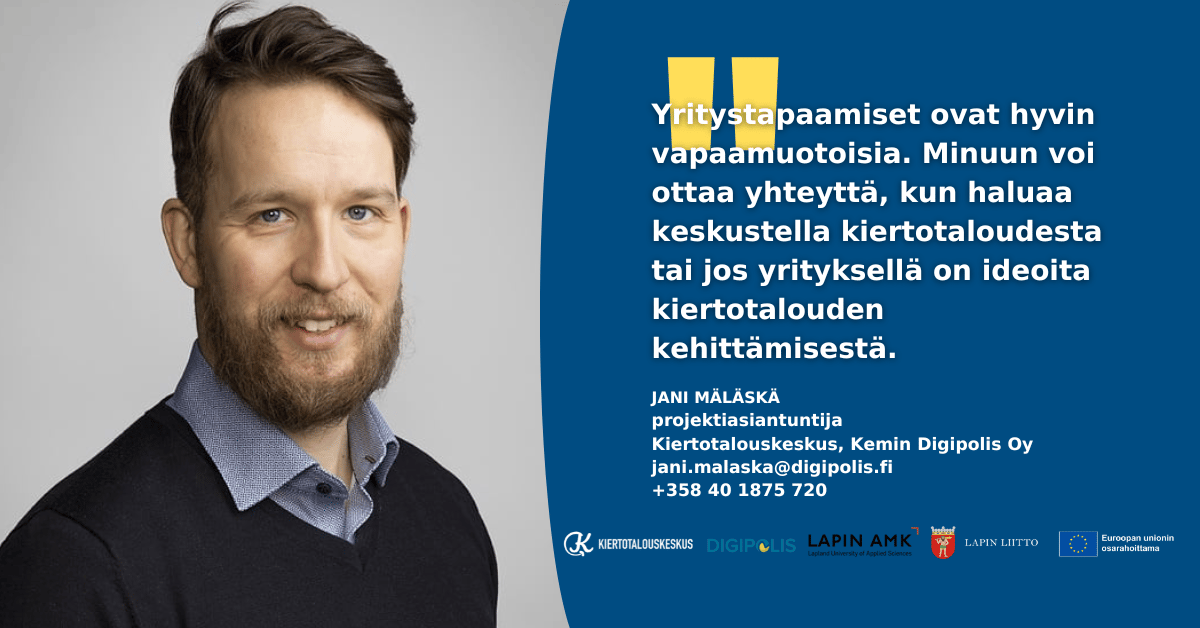 Kiertotalouden kiihdyttäjä Jani Mäläskä Kiertotalouskeskuksesta kiertää lappilaisia pk-yrityksiä ja selvittää yhdessä yrittäjien kanssa, miten ne...