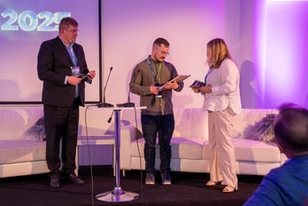 Kiertotalouskeskuksen johtaja Tuomas Pussila ja viestintäpäällikkö Soile Suvanto julkistivat Vuoden Kiertotalousteko -palkinnon saajan ACEF2024- forumissa 30. toukokuuta. Palkinnon sai kiertotalous- ja kaivospalveluyhtiö Tapojärvi ja tunnustuksen vastaanotti liiketoimintajohtaja Veli-Matti Marttala (keskellä). KUVA VIDECAM