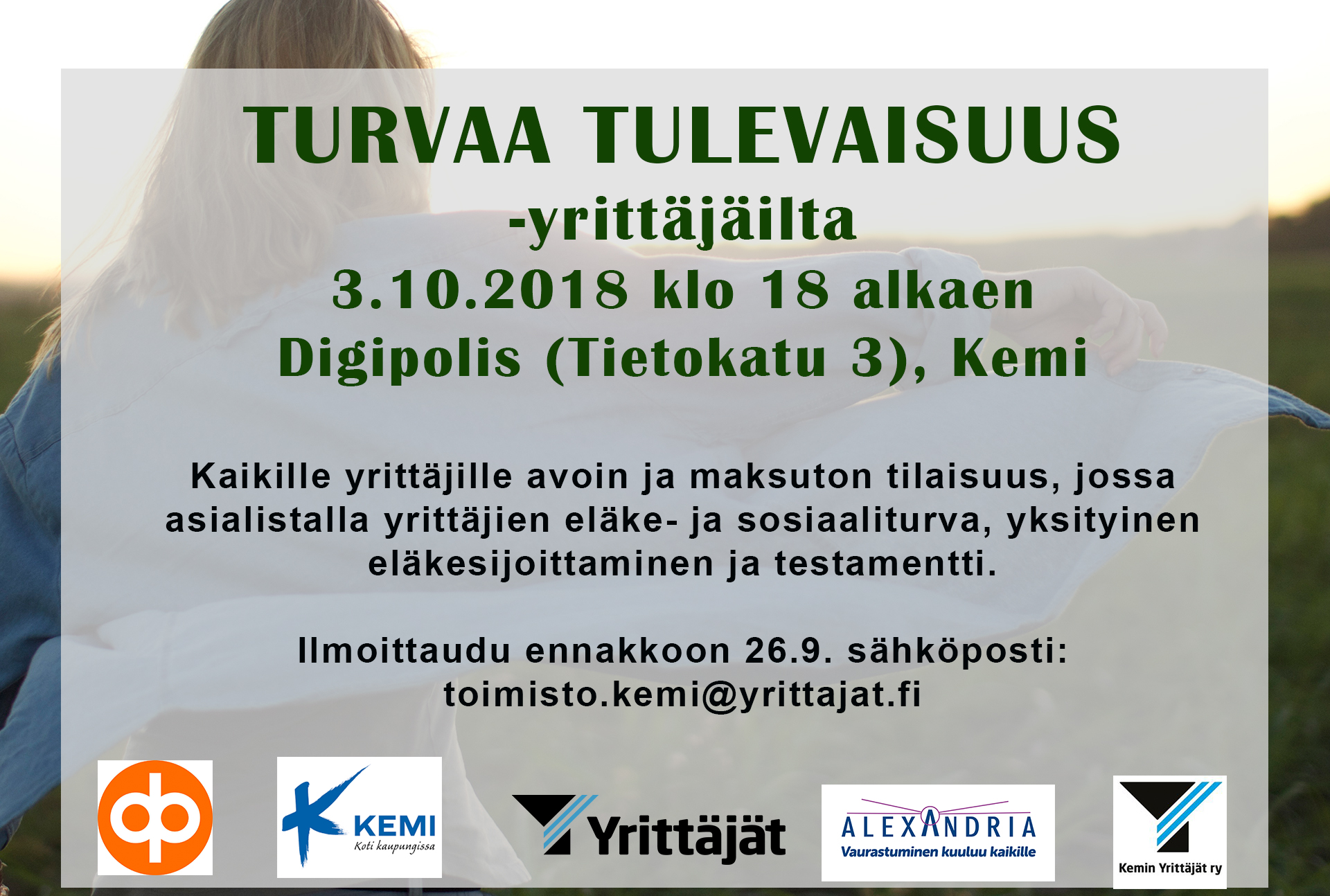 Kemin Yrittäjät järjestää ke 3.10. klo 18 alkaen Kemin Digipoliksessa (Tietokatu 3, 94600 Kemi) Turvaa tulevaisuus - yrittäjäillan. Tilaisuus on maksuton ja kaikille yrittäjille avoin. Illan aikana pohditaan ja esitellään tapetilla jo jonkin aikaa ollutta yrittäjän eläke- ja sosiaaliturvaa, yksityistä eläkesijoittamista ja testamenttia. Tilaisuuden aloittaa asiantuntijoiden puheenvuorot, jonka jälkeen pidetään paneelikeskustelu. Paneeliin osallistuu asiantuntijoita Suomen Yrittäjistä, eläkeyhtiöstä ja pankista sekä yrittäjiä. Ilmoittautuminen kahvitarjoilun vuoksi 26.9. mennessä kemi.toimisto@yrittajat.fi
